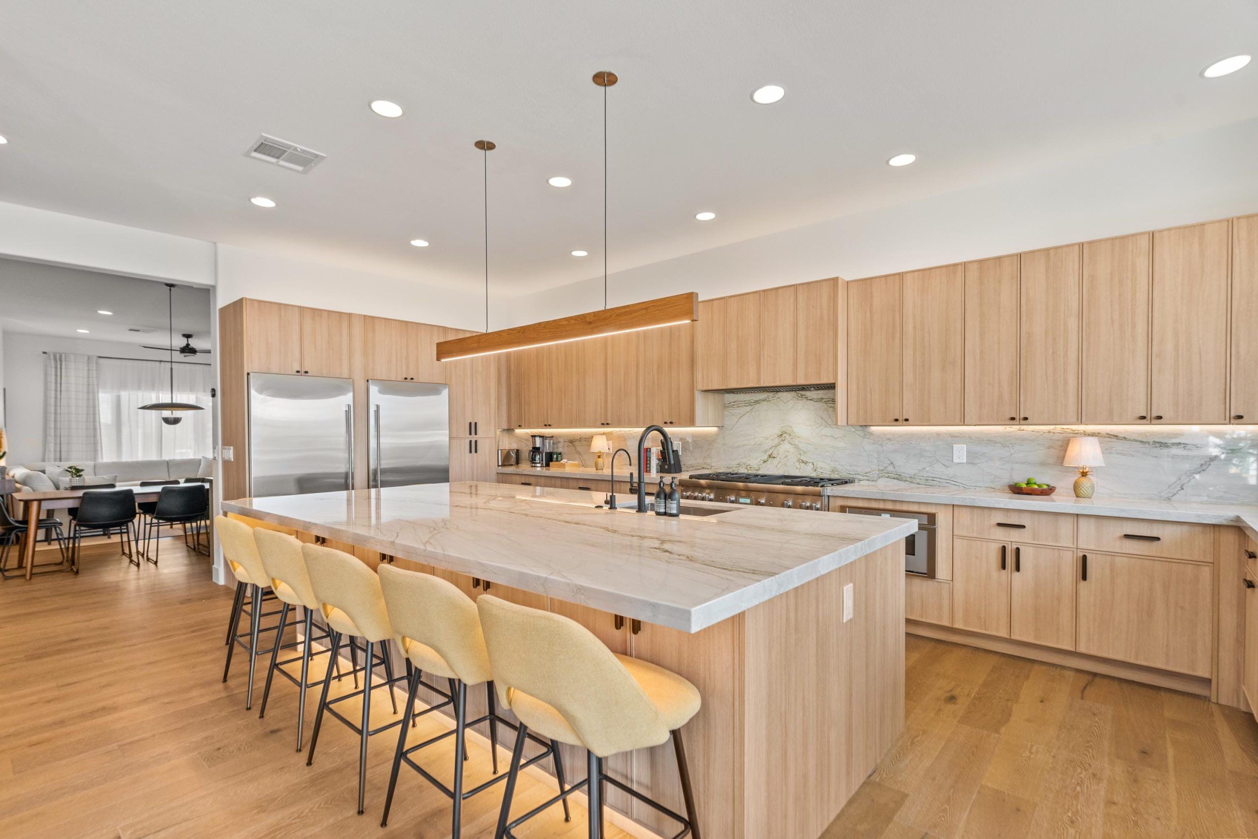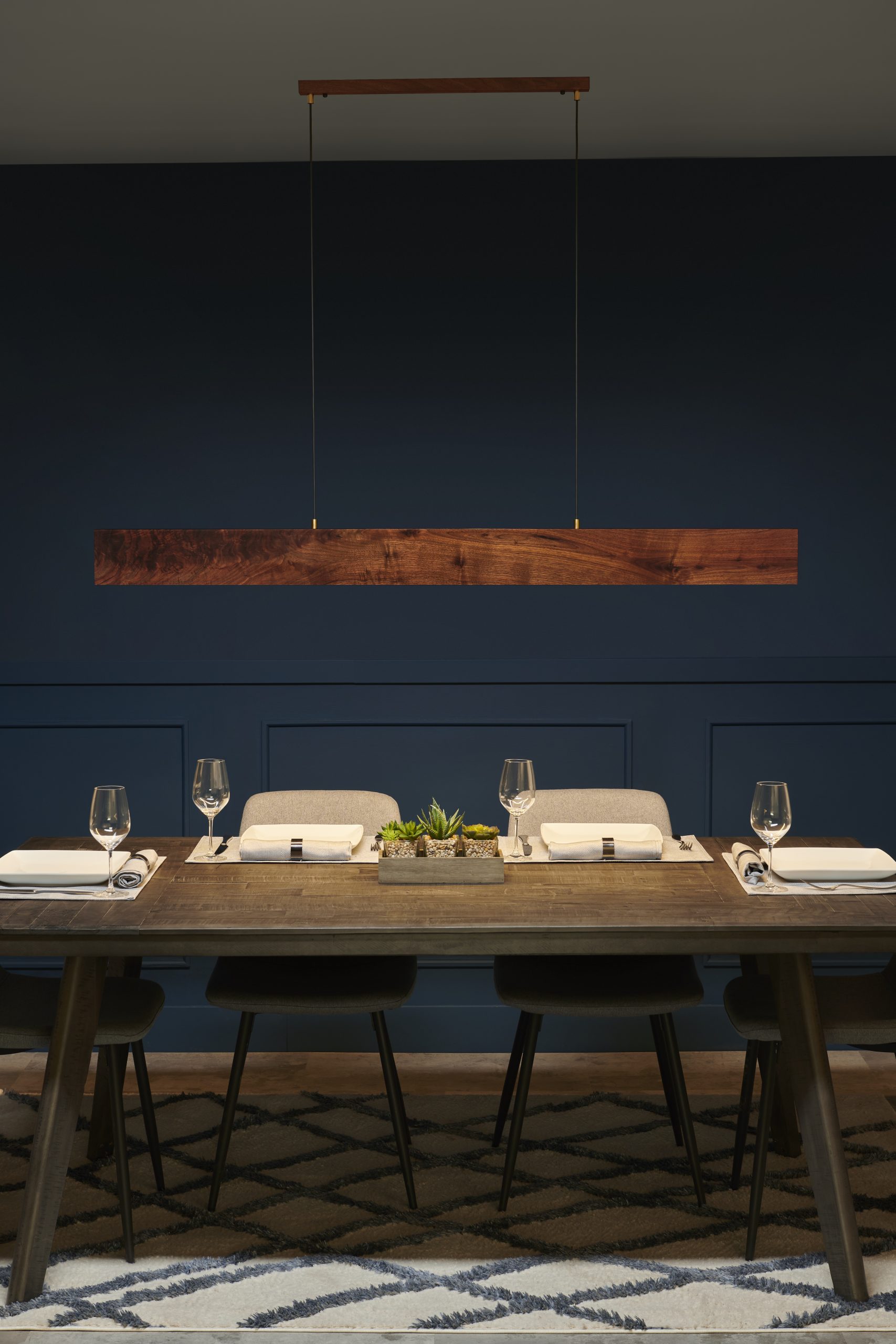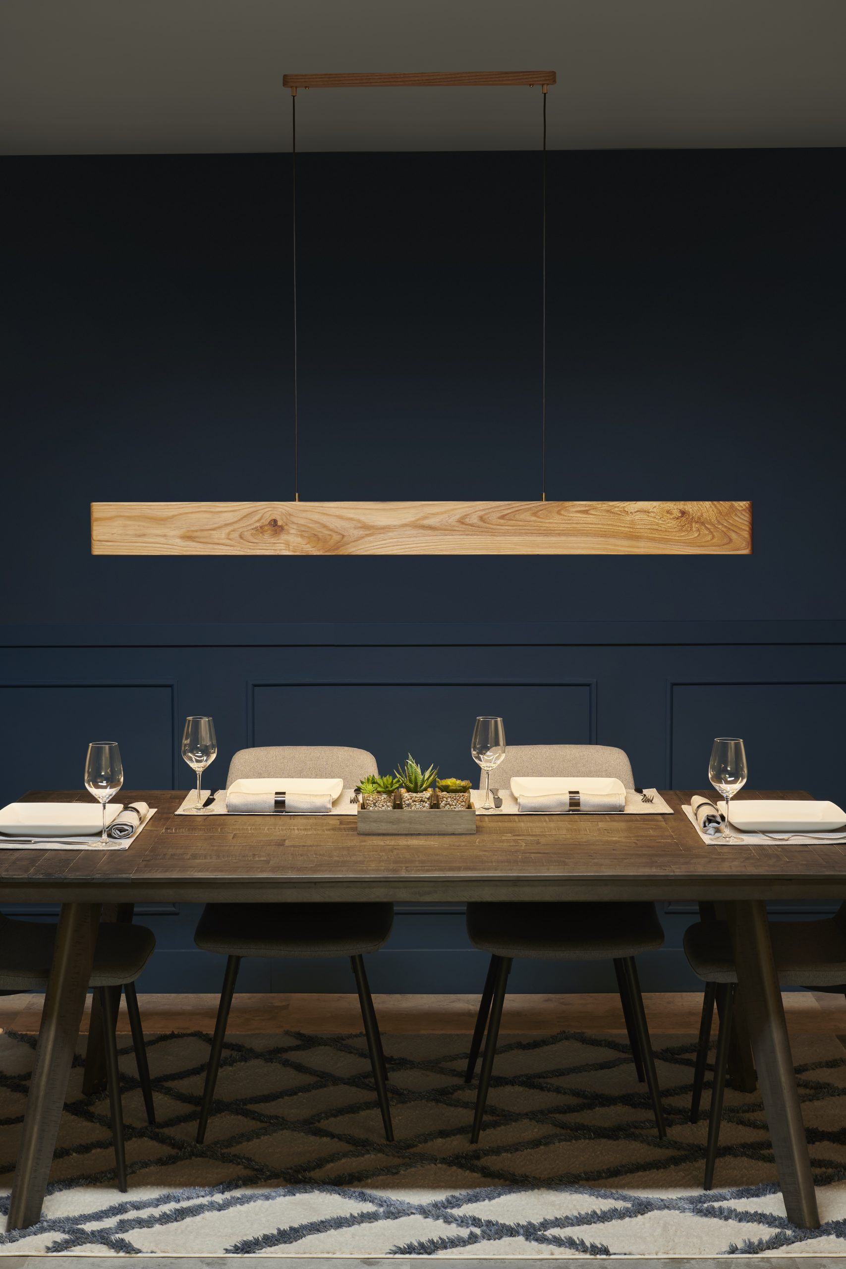 The Tolv Linear Pendant is defined by its pronounced vertical profile, allowing the natural structure of solid hardwood to become the primary visual expression. With an expanded cross section, the form reveals the depth and variation of wood grain, creating a strong material presence within a refined linear silhouette.